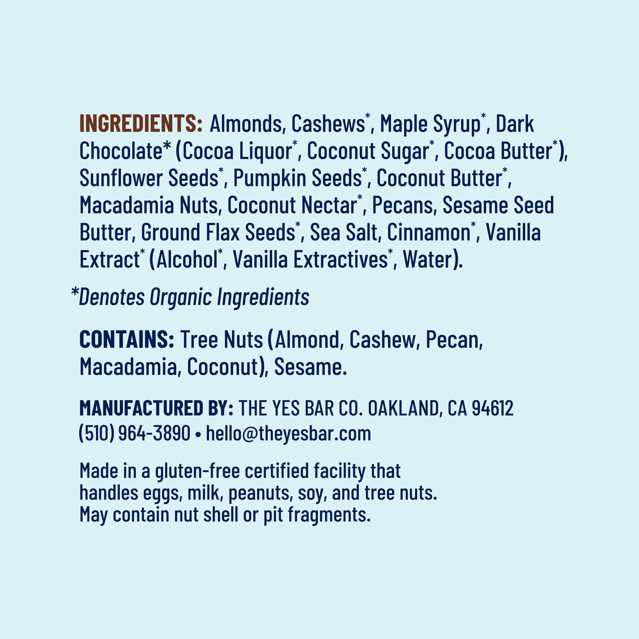 INGREDIENTS: Almonds, Maple Syrup*, Dark Chocolate* (Organic Cocoa Liquor, Organic Coconut Sugar, Organic Cocoa Butter), Sunflower Seeds*, Pumpkin Seeds*, Cashews*, Coconut Butter*, Macadamia Nuts, Coconut Nectar*, Pecans, Sesame Seed Butter, Ground Flax Seeds*, Sea Salt, Cinnamon*, Vanilla Extract* (Organic Alcohol, Organic Vanilla Extractives, Water). *Organic.