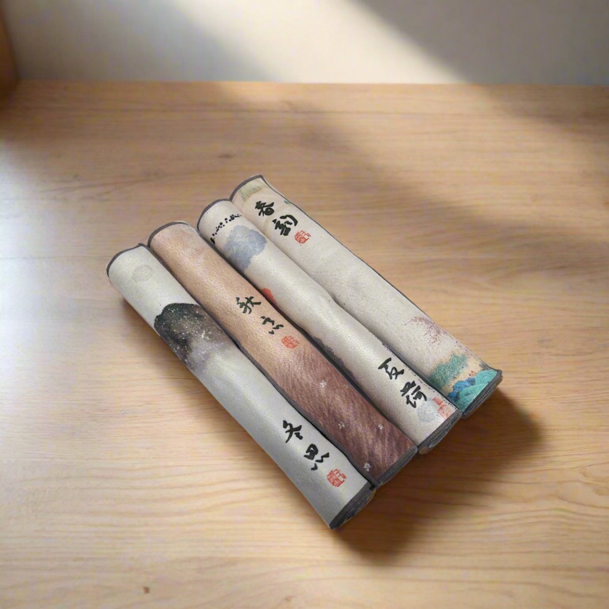 This multi use tea towel measures 11"x11" and features a versatile design. It has a dual-sided construction: One side features water-resistant faux suede, while the other side is five times more absorbent than a regular tea towel. The towel is available in four styles—spring, summer, autumn, and winter—each offering unique colors and patterns. The Faux suede side is great to use as a tea mat and also functions effectively as a teapot polishing towel.