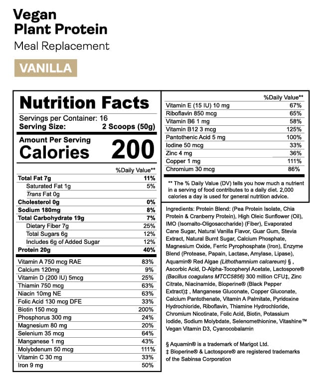 • 20 grams of plant protein per serving from pea protein isolate, cranberry seed protein, and chia seed protein.