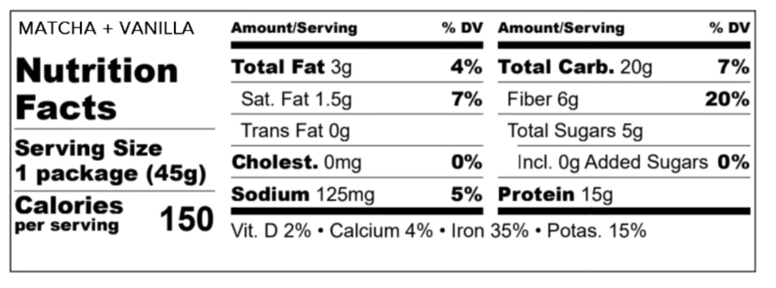 Ingredients:  Pumpkin Seed Protein*, Gelatinized Maca*, Banana Powder*, Tocotrienols*, Coconut Milk*, Ginger*, Psyllium Husk*, Vanilla Powder*, Ceremonial Matcha*, Wheatgrass*, Ashwagandha*, Spirulina*, Enzyme Blend [Amylase, Protease, Peptidase, Papain, Lactase, Lipase], Pink Himalayan Salt, Locust Bean Gum*, Xanthan Gum, Probiotic Blend [Lactobacillus Acidophilus, Lactobacillus Plantarum, Lactobacillus Salivarius, Bifidobacterium Breve, Bifidobacterium Lactis], Stevia Reb-A*, Monkfruit (Luo Han Guo)* *Certified Organic